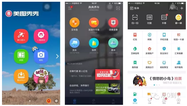 跳板式导航有被称作九宫格式导航,将各个入口都平铺展示在页面上,该种导航适合功能较多且功能之间较为独立的产品。目前纯粹的跳板式导航其实较少,大多与Tab式导航复合使用。常见的应用比如美图秀秀、典典养车、支付宝等。